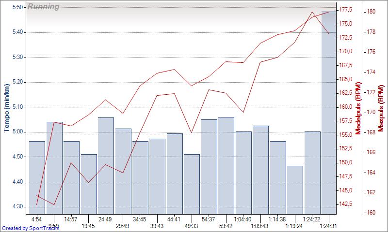 Totalt blev det alltså 17 km @ 4:58 med snittpuls 162 bpm (82% av HRmax)