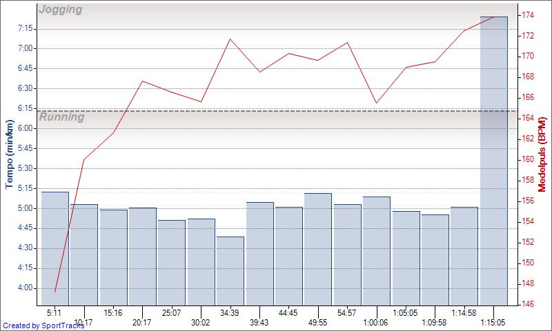 Vilket underbart pass det blev! Summeringen är 15 km @ 5:00 och snittpuls 166 bpm (83%), inga direkta bra värden egentligen, men jag nöjer mig med känslan som passet lämnade kvar i mig. Påminner om känslan man får när man är kär, ni kanske förstår då…