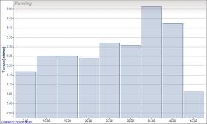 Analysen visar att jag höll ett väldigt jämnt tempo genom hela loppet. Bortsett från sträckan mellan Slussen och krönet på Västerbron, så låg snittfarten ca +/- 10 sek från snittfarten. Pga svackan och att jag missuppfattat snittiden på klockan så tappade jag mycket tid under de 5 kilometerna.