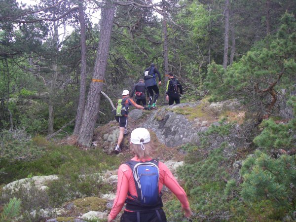 I samlad tropp tog vi oss fram och lyckades redan efter nån kilometer att springa fel! Snabbt fick vi springa samma väg tillbaka och leta markeringar och kom snart på rätt kurs igen. Nu insåg man hur viktigt det var att ha ögonen med sig. Underlaget var så beskaffat att det krävdes en del uppmärksamhet för att undvika att snubbla, vilket gjorde att det var lätt att man glömde bort att titta efter markeringarna.