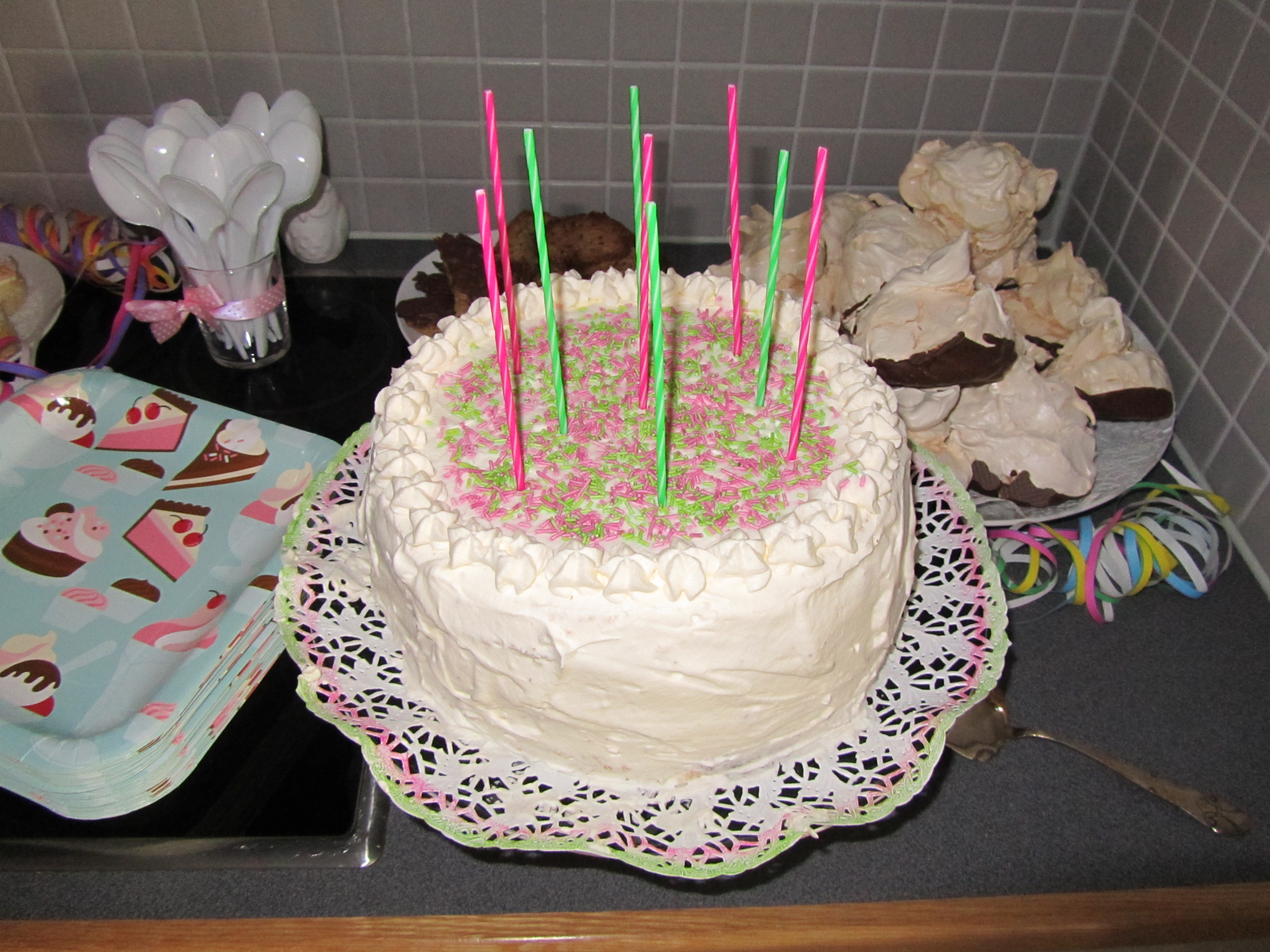 Jättetårtan (i fyra lager med blåbär, hallon och vaniljkräm) tillsammans med publifvoriten jättemaränger (t.h) Bakom gömde vi mina lite misslyckade, men väldigt popuära, havreflarn.