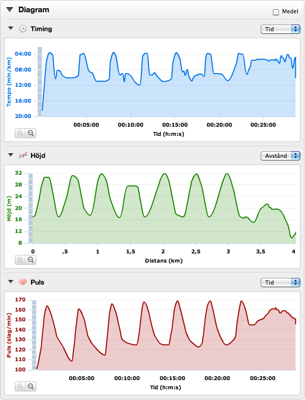 Efter initialt strul så var det bara att beta av intervallerna en efter en. Den långa vilan var lite jobbig, då jag hann kylas ned och stelna till inför varje intervall. Största anledningen till den långa vilan är väl att hinna återhämta sig och sänka pulsen rejält samt vädra ut eventuell mjölksyra.