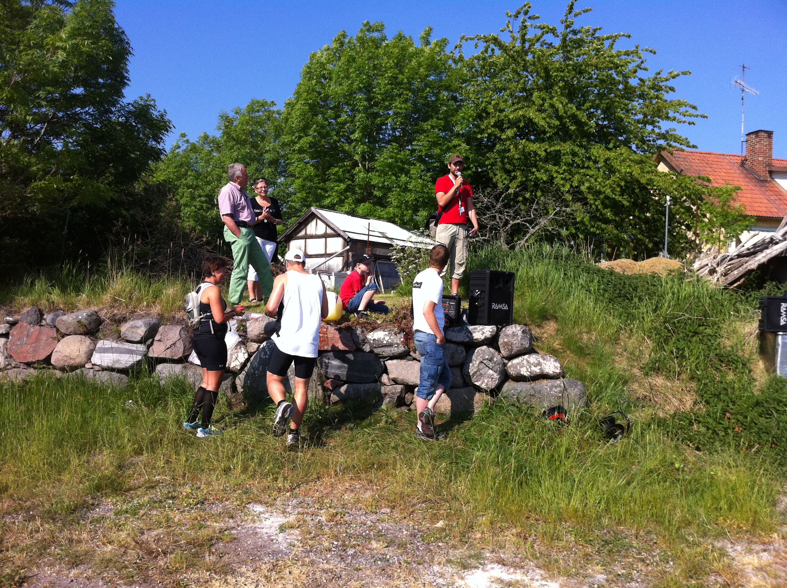 Jag gjorde de sista förberedelserna inför starten. Blandade till en tretimmarsflaska med Perpetuem, hällde tre timmars pulver i den andra flaskan för senare tillblandning. Blåsan fyllde jag redan innan jag åkte hemifrån. Det var svalt och fint i Grisslehamn, så jag trodde inte att jag skulle ha så stor nytta av kylkepsen, vristbandet och haslduken, så jag packade ner de sistnämnda och gick för att blöta kepsen. Man ska egentligen försänka den i kallt vatten i 1-2 minuter för bästa funktion, men jag fick nöja mig med att skölja den från en slang. Efter alla förberedelser var klara var det bara att vänta på start. Medan vi väntade så pratade en kvinna om lite allt möjligt kring Jättelångt, Grisslehamn och annat smått och gott. Plötsligt hörde jag mitt namn nämnas och jag blev uppkallad för en kort intervju. Lite lätt överrumplad stod jag där och svarade på hennes frågor om jag sprungit tidigare och annat. Roligt!
