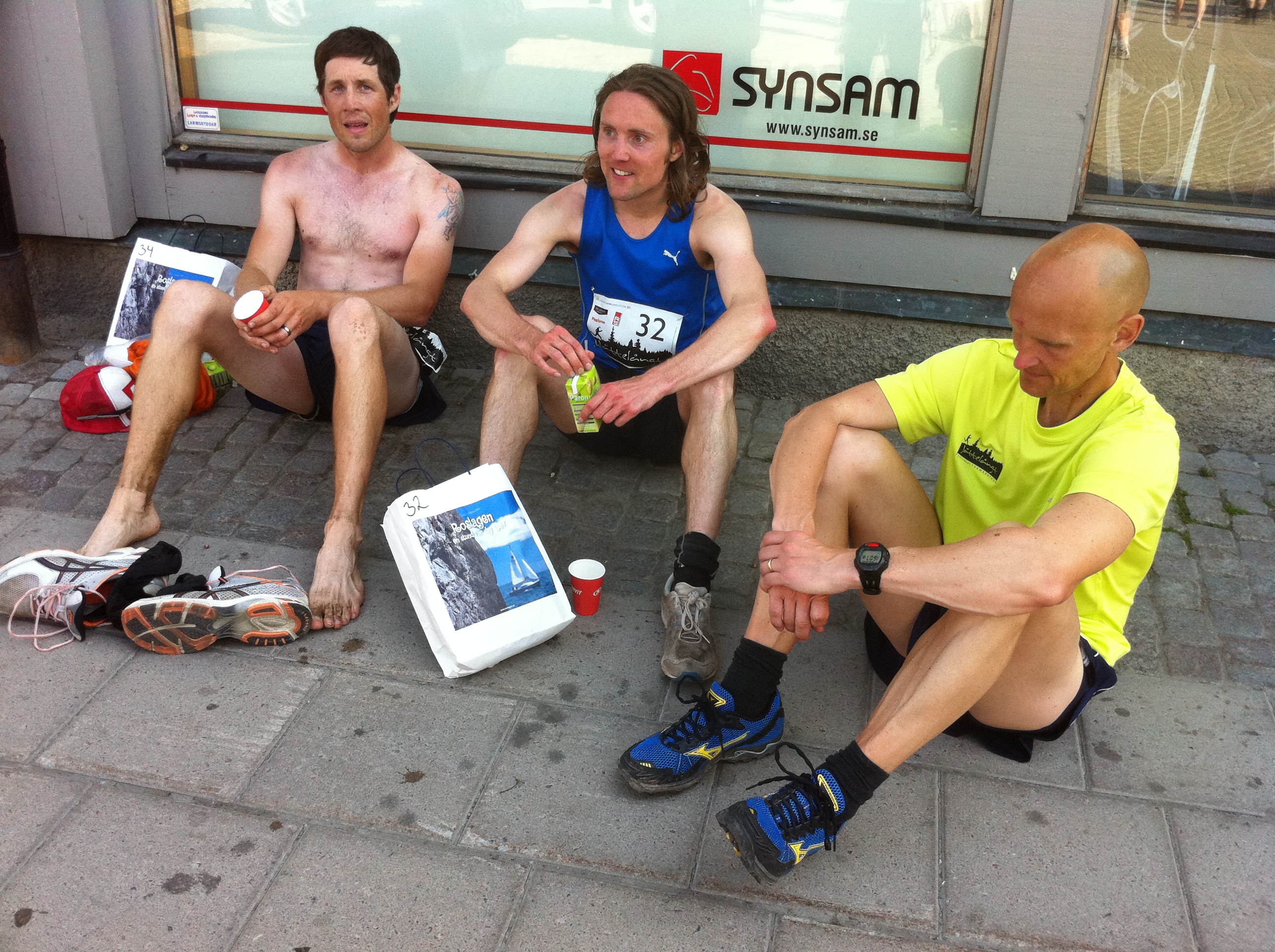 Det var ca 10 löpare vid denna station och tre av dem hade brutit här. Det var när jag träffade dem som jag tog det definitiva beslutet att bryta. När beslutet väl var taget kändes det så mycket bättre. Det är ju inte första gången jag bryter ett lopp, men tidigare har det berott på löparknä, så det kändes lite konstigt att bryta pga värmen. Jag anmälde att jag brutit och sattes upp på listan för dem som behövde skjuts till målet i Norrtälje. Sate mig sen och språkade med andra löpare. Efter ca 20 minuter kom Jan-Erik, Micke och Cecilia till kontrollen, vilket förvånade mig. Jag hade sprungit med Jan-Erik och Cecilia tidigare, men trodde det dragit ifrån mig, så jag blev väldigt överraskad att se dem. De hade tagit det lugnt och även om de kämpade med värmen så såg de väldigt starka ut. Tio minuter senare kom min skjuts och under tiden kom ännu en löpare in som bröt. I bilen träffade jag ytterligare en löpare som gett upp! Vi föll som flugor!
