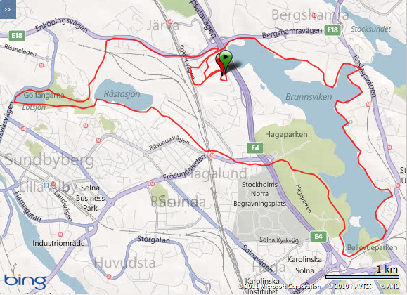 Söndagen kom och mitt sista pass denna vecka var 20 km distans i typ långpasstempo, ett pass jag egentligen skulle gjort på lördagen. Nu blev ju lördagens pass just i det tempot, så jag beslöt mig för att köra söndagens pass aningens snabbare. Sent på eftermiddagen kom jag iväg och styrde kosan norr om Brunnsviken och följde sen Hälsans Stig fram till Koppartälten där jag via Haga Norra sprang mot Lötsjön och rundade den för att sen springa längs E18 tillbaka hem. En handjagare med Perpetuem fick räcka som färdkost. Fyllde på den med vatten vid Brunnsvikens kanotklubb efter drygt 6 km så att den skulle räcka, vilket den gjorde. Mentalt var jag väldigt trött på att springa sista typ 4 km, jag kunde inte slå den känslan ur hågen hur jag än försökte. Dessutom hade det gått hål på innerlåret på mina tights, så jag hade dessutom dragit på mig ett rejält skavsår. Hade ju ännu ett oskönt skavsår i ljumsken som jag dragits med sen i torsdags, så nu började jag lixom falla isär på nåt sätt kändes det som. Det var inte mitt mysigaste pass nånsin, men det var tillfredsställande att ändå känna mig så fräsch i kroppen, inte alls speciellt tung eller sliten utan det var mest mentalt som det var jobbigt. Jag var mätt på löpning helt enkelt. Sista passet blev 20 km @ 6:00 med 139 bpm (69%) snittpuls. Vet inte om det blivit något fel på pulsbandet eller om kroppen helt enkelt reagerat på senaste tidens träning och gått över till högre andel fettförbränning, men pulsen var enormt låg under detta pass för att vara mig.