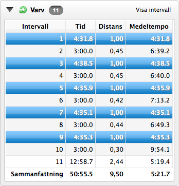 Pratade med Magnus i går morse och han frågade hur det kändes inför Bislett. Jag svarade att jag inte riktigt visste, för jag har inte haft någon känsla alls på sistone. Mer åt det tunga än det lätta, men detta intervallpass tippade över känslan åt det lätta hållet. Resultatet ser ni nedan. De markerade raderna är intervallerna.