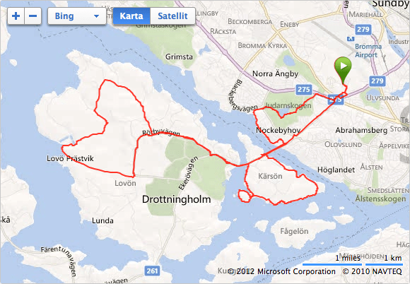 Efter ca 7 km, 10 km totalt, hade jag rundan Kärsön och jag var redan lite trött (!) Passerade Drottningholm och svängde västerut på Lovön.. Vägen till Ekerö är förbaskat tråkig att springa, så jag valde att utforska småvägarna istället. Passerade FRA och kom så småningom till Lovö Kyrka, där jag frågade om vägen och valde att fortsätta västerut mot Prästvik och passerade Lovöns vattenverk innan vägen tog mig österut igen och jag var efter ett tag tillbaka på Drottningholm.