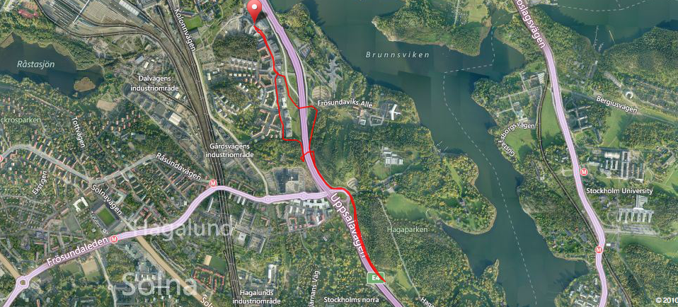 Första intervallen gick lite stolpigt och den kändes väldigt lång, men efter andra och tredje började jag bli van. Dock kände jag ganska tidigt att 5 intervaller förmodligen skulle räcka. Just den 5:e intervallen var den tyngsta och när jag avslutat den överlade med mig själv en stund innan jag beslöt mig för att springa en intervall till. När den 6:e intervallen avslutats var det lika bra att bita ihop och göra de sista två. Det kändes lite vekt att ge upp lixom. Sagt och gjort kämpade jag mig i genom de sista två och kunde med högt huvud (nåja, mentalt iaf) springa hem igen.