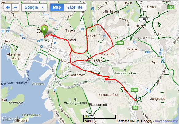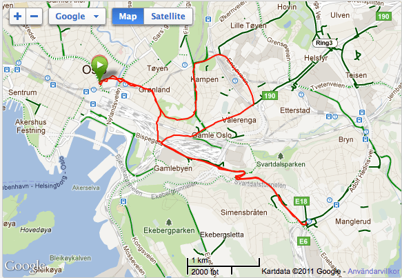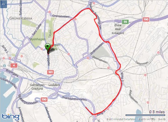 I morse bar det av till Oslo för tre dagars mässa hos en av mina återförsäljare. Packade naturligtvis mina träningskläder och planerade ett distanspass innan middagen. Enligt en av mina kunder här i Oslo så skulle det komma in ett regnväder på kvällen, så min tanke var att komma ut innan 17-tiden. Regnvädret kunde inte klockan tyvärr och redan vid 15 var det här. Jag kom hursomhelst iväg vid 17-tiden och fick då nöjet att springa i ösregn. På schemat stod det 12-15 km och jag funderade allvarligt på att korta ned det ytterligare, men när jag väl kommit 6 km och kunde vända tillbaka så kändes det löjligt, så jag fortsätte. Jag var ju redan helt dyngsur, så det var lika bra att köra hela vägen.