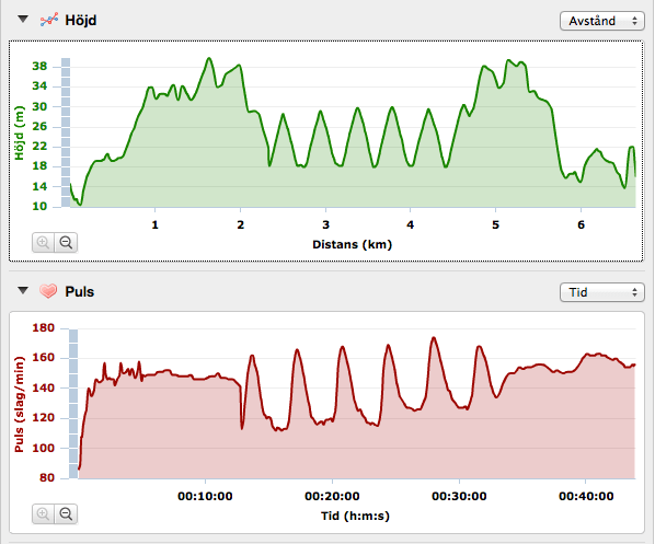 Istället för min vanliga backe valde jag att springa bort till Hagaparken och den backe som går från Koppartälten ned till vattnet. Där rev jag av 6 st 35 sekundersintervaller med tre minuters vila emellan. Eftersom det va första gången jag körde intervaller i den backen så var den första intervallen lite trevande, men sen släppte det och jag kunde pressa på ganska ordentligt. De sista meterna på den sista intervallen var nästan droppen, då fanns inte mycket kvar att ge faktiskt. Glad i hågen kunde jag iallafall jogga hemåt. Få pass får mig att må så bra som backintervaller, men det har ni kanske redan förstått?
