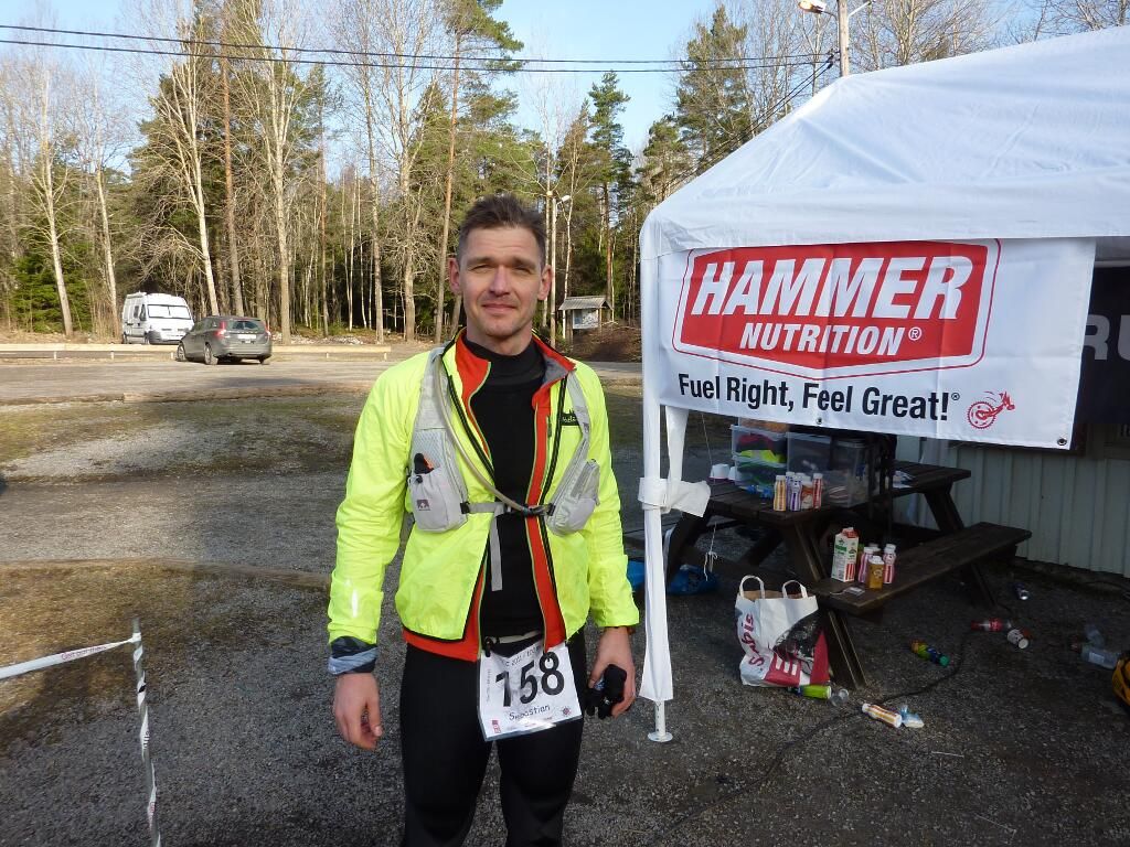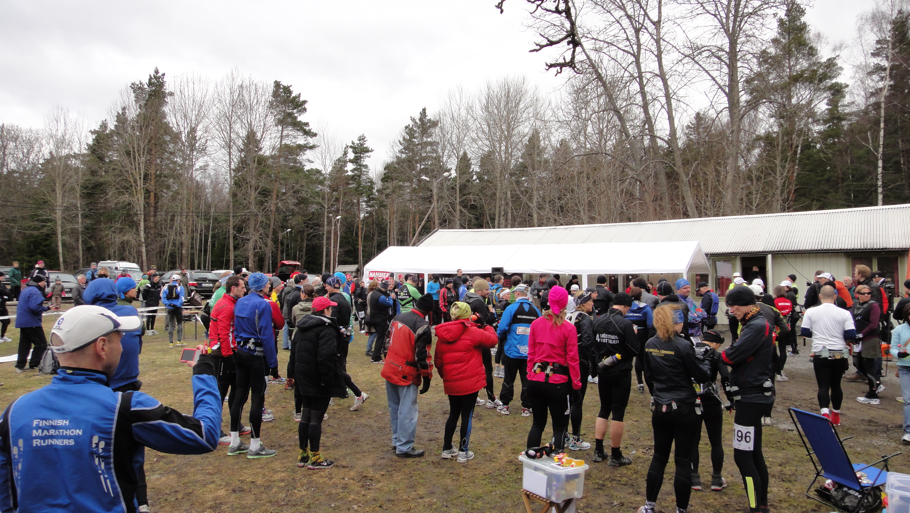 Vid halv 9 fick jag hjälp av min fru och dotter att bära ned all min utrustning till bilen. Två plastbackar samt två väskor! Jag hade med mig allt! Efter puss- och kramkalas samt lyckosparkar i rumpan så bar det av till Ensta Krog. Där var det fortfarande ganska folktomt, men allteftersom tiden gick så fylldes det på med löpare och annat ”löst folk”. Det var längesen jag var på ett lopp, så det var jätteroligt att träffa alla gamla bekanta. Anna, hennes pappa samt Krister dök upp och efter en stund kom även Magnus. Jag hade burit fram alla min prylar och väntade nu bara på att Andreas skulle dyka upp och resa sitt tält. Andreas kom, men tältresningen fick vänta tills efter start för att undvika kaos. Det kändes lite som ”Team Andreas Falk”.