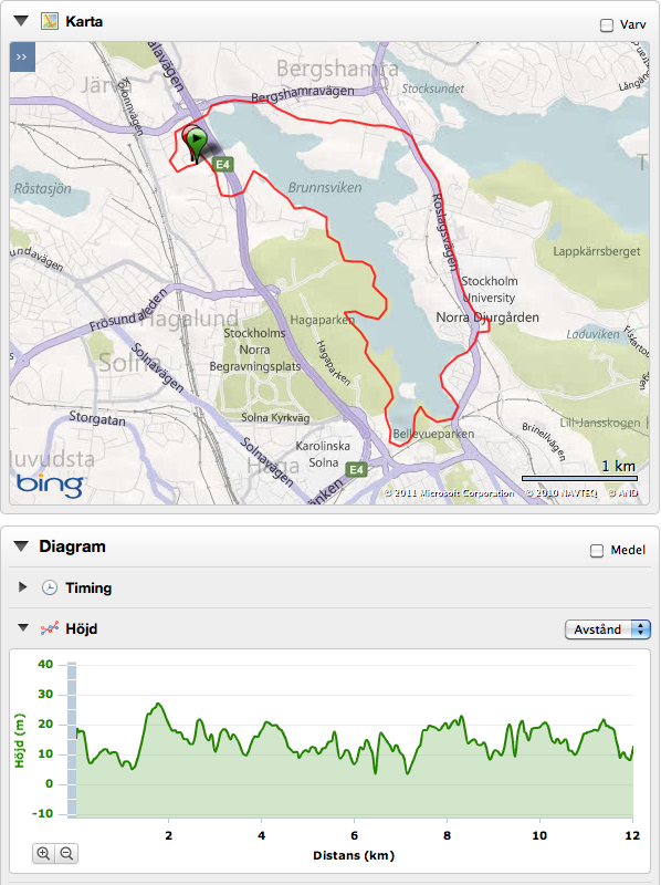 Det blev en sväng runt Brunnsviken, men valde att inte springa på stigarna längs vattnet (Hälsans stig) eftersom de är knöliga och isiga. Istället valde jag gång- och cykelvägarna på östra sidan av viken. Kroppen kändes förvånansvärt pigg, två dagars vila gjorde uppenbarligen underverk. Tittade aldrig på klockan, utan gick helt på känsla. Tog heller aldrig i, utan slog av på tempot så snart det kändes minsta ansträngande. Allt för att inte stressa kroppen i onödan. Känslan av utmattning i fredags fanns färskt i minnet.