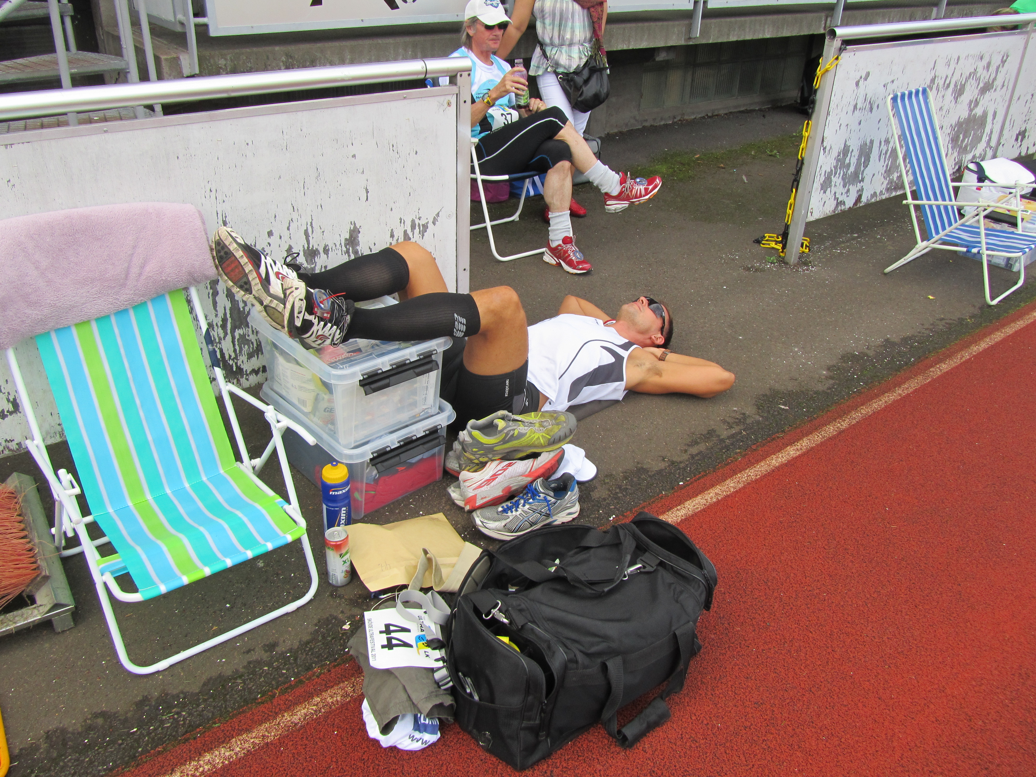Varven gick (i dubbel bemärkelse) och jag traskade på. Eftersom jag gick så kunde jag även sjunga för mig själv utan att bli andfådd, så det gjorde jag. Humöret var på topp och tiden bara gick. Benen och fötterna var slitna, men ställde troget upp. Vid ett tillfälle lade jag mig ned en stund med benen högt för att avlasta dem lite. Magnus bäddade in mig så gott det gick för att stävja frossan som obönhörligen kom när jag var stilla en stund. Jag kunde nästan somna till, men frossan och blåsan satte stopp för det. Ut på banan igen och så var det åter dags att knapra kilometer. Framåt småtimmarna hade ganska många löpare lagt sig att sova av flera anledningar, men vi var ett gäng som tappert kämpade på ute på banan.