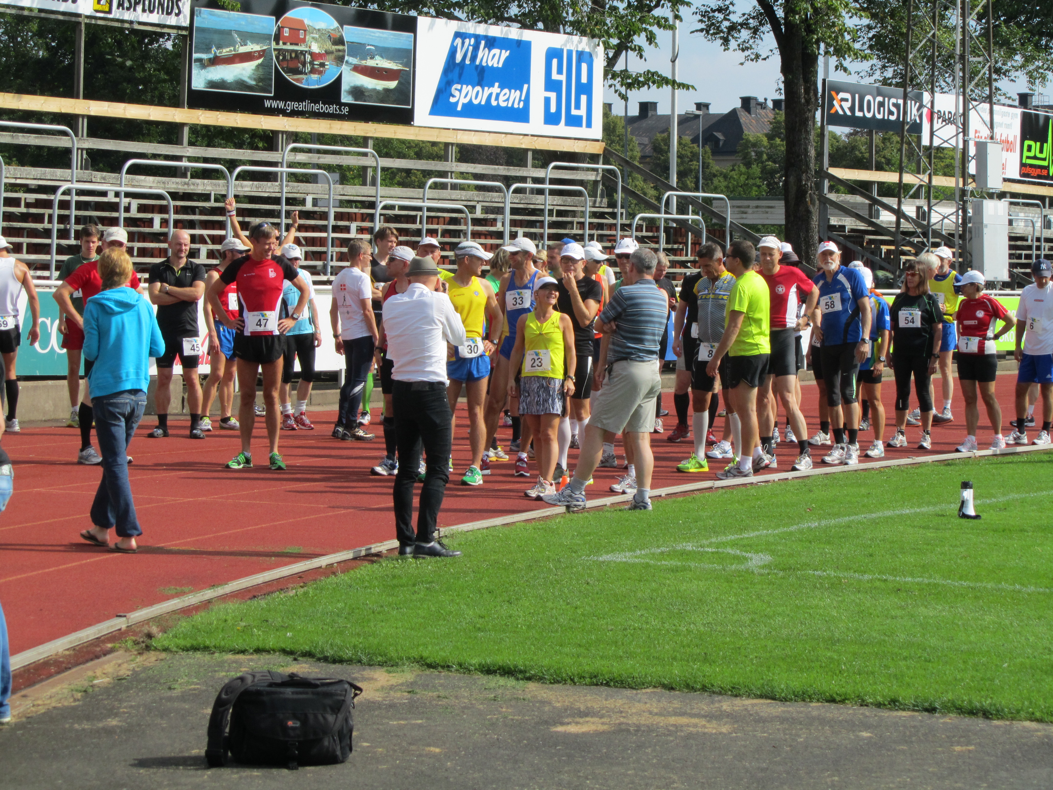 Väl framme i Skövde vid halv 10 åkte vi direkt till Södermalms IP där vi var bland de första på plats. Solen sken från en klarblå himmel och värmen som slog emot oss när vi steg ur bilen bådade inte gott. Jag var inte förberedd på värme, snarare tvärtom, jag hade ju packat för sämre väder. Snackade med vänner och bekanta, hämtade ut nummerlapp och släntrade omkring medan jag väntade på att börja förbereda mig. Jag ringde upp Andreas och vi snackade lite ”taktik”. Det kändes bra att ta ett sista snack med honom för att få lite råd, det lugnade. Jag är oftast lite spänd eller snarare förväntansfull inför lopp. Det är mycket som ska fixas och jag vill kunna prestera optimalt, annars får det vara. Andreas föreslog att jag skulle börja loppet med att gå ett varv, något som kändes ganska fjärran. Tanken var att låta alla springa iväg och fokusera på mitt eget lopp. Det är så lätt att dras med i tempot.