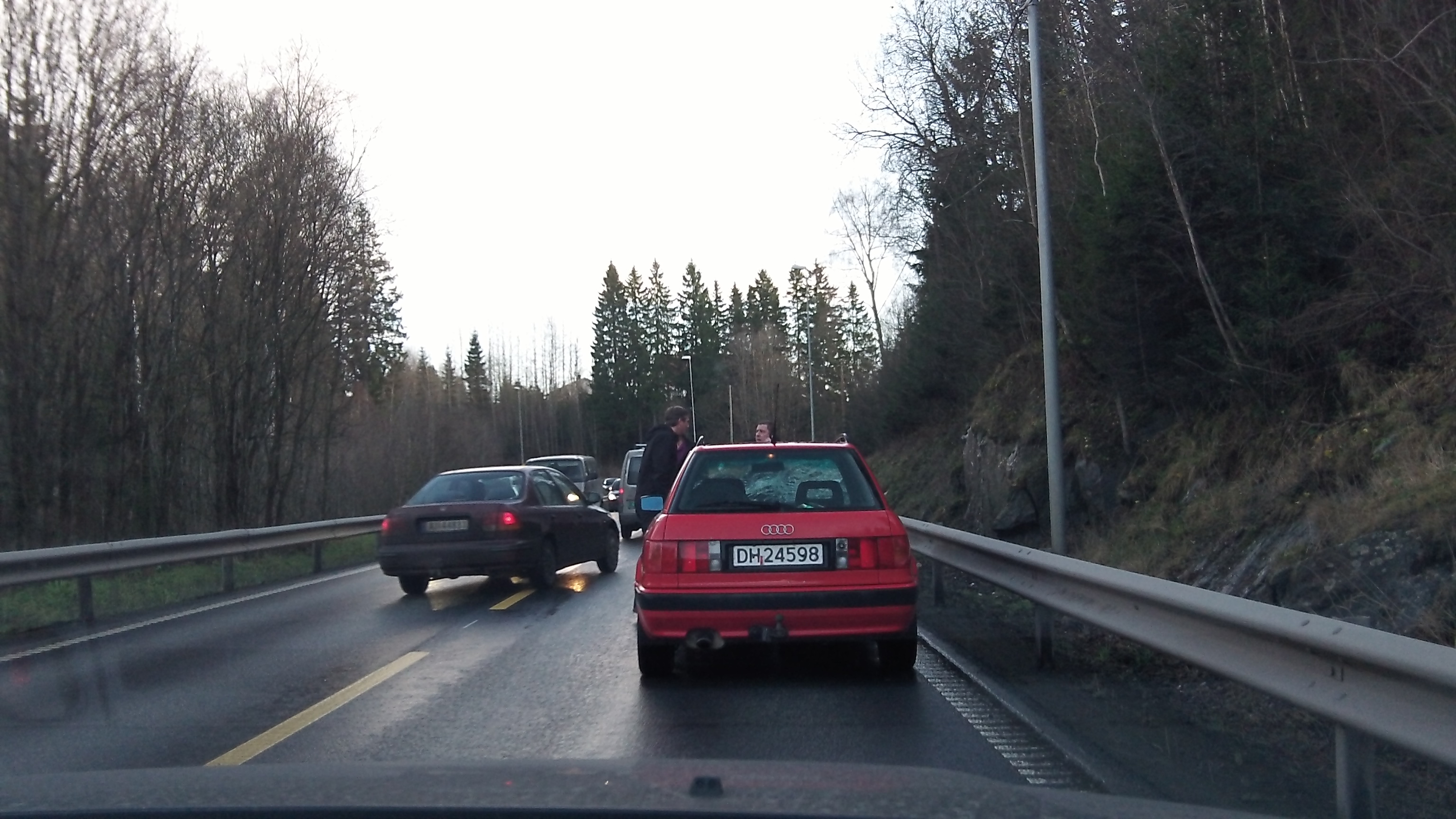 Magnus hade hämtat bilen på morgonen och parkerat utanför stadion, så det var en kort, men ändå smärtsamt, promenad innan jag kunde sjunka ned i sätet och försöka slappna av. Vi lämnade Bislett och Oslo och vände kosan mot Solna. Vi virrade runt lite innan vi kom ur Oslo, men sen flöt det i princip bara på. Några mil från gränsen hoppade plötsligt en älgko fram med en hund i släptåg. Bilen framför oss hann i bromsa utan körde rätt in i älgen från sidan, som landade på motorhuv och spräckte vindrutan innan den skakade på huvudet och sprang vidare in i skogen på andra sidan vägen. Hunden skällde och bet älgen i baken, men älgen verkade bry sig måttligt. Situationen var helt surrealistisk! Magnus sprang fram till bilen för att kolla så allt gått bra. Föraren var oskadd men väldig chockad, men repade sig efter en stund och efter att Magnus lämnat sitt telefonnummer så kunde vi fortsätta resa hemåt. Vilken avslutning på vår helg minsann!