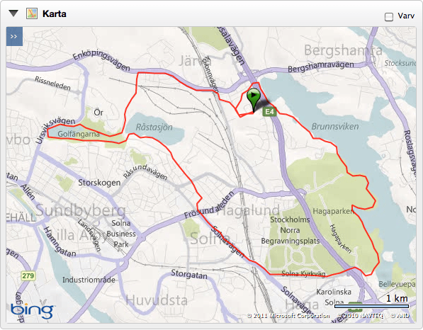 Sprang längs Brunnsviken ned till Haga Forum, där jag svängde upp mot KS och vidare mot Solna C. Därefter gick färden mot Råstasjön och Lötsjön innan jag styrde kosan hemåt. Vädret var i det närmsta helt perfekt, varken för varmt eller för kallt. Skorna kändes så där underbart lätta och min initiala fruktan om ”vadkollaps” visade sig ogrundad. Ända sen jag började med VFF har jag övergått till att landa mer på främre delen av foten, vilket visade sig gett utdelning med Kinvarorna. Jag behövde inte lägga om steget, utan sprang som vanligt. Trots att jag hade närmare 130 km i benen de sista 8 dagarna så kändes kroppen helt ok och jag kunde genomföra passet utan mankemang. Skorna ar helt underbara! Mina tår var väldigt ömma efter söndagens långpass, men tack vare att Kinvara är så tunn så var det inget problem, bortsett från i nedförsbackarna där tårna fick ta lite mer stryk.