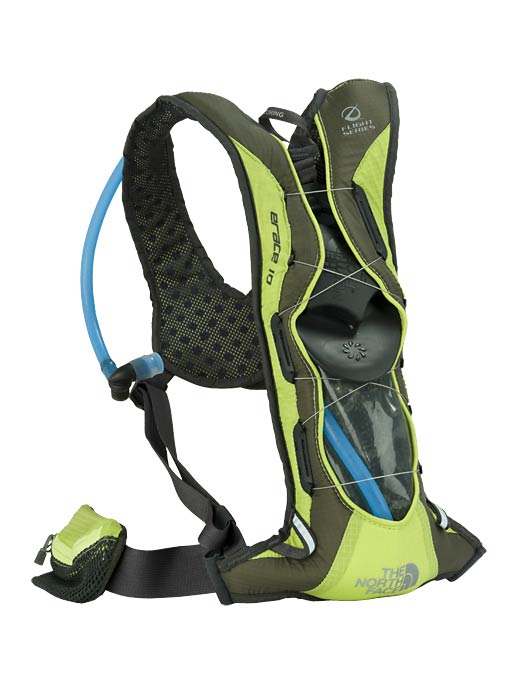 Vätskeblåsan rymmer 1,5 liter och den i övrigt mycket spartanskt utrustade ryggsäcken är utrustad med små borttagbara väskor på midjeremmen.