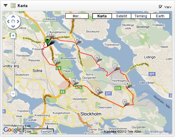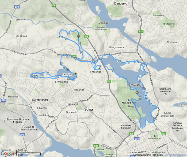 Jag valde att ta med två flaskor med vatten, en i handen och en i vätskebältet, vilket gav totalt 12 dl. Dessutom hade jag med mig gel samt Perpetuem Solids. Jag tog samma väg som dagen innan, dvs från Frösunda och via Stocksund sprang jag längs vattnet till Djursholm, där jag vände tillbaka. Det var lite segt generellt från 15 km, men först runt 20 km som jag kände av energibristen. Den sista biten hem var faktiskt något av en kamp, då jag kände mig i princip helt tom. Pulsmätningen började strula redan från start, så den stängde jag av efter en mil.