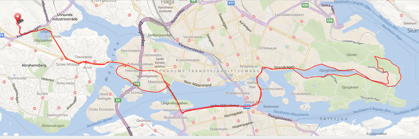 Följde Söder Mälarstrand till Slussen där jag styrde kosan mot Strandvägen via Slottet.Sprang sen Strandvägen bort till Djurgårsbron som jag sprang över och följde Djurgårdskanalen till sista bron. Sprang över till Gärdet men vek tillbaka sen till Djurgårdskanalen och sprang i princip samma väg tillbaka. Tanken med förra veckans långpass var att hålla högre tempo, men det sket sig på alla sätt. Idag gick det dock mycket bättre och jag kunde hålla ett lagom tempo utan större ansträngning. Höll mig till lättsprunget underlag mestadels, just för att inte göra samma misstag som sist när jag forcerade den igenväxta Kärsön.