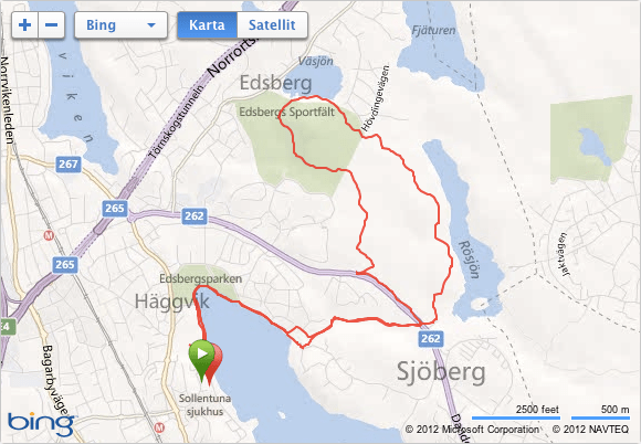 Sista vätskekontrollen kommer två kilometer innan mål. Man ser målet härifrån, men måste först runda en sjö och de sista kilometerna innehåller några rejäla backar. Den sista milen blev jag passerad av två killar och passerade själv typ 7-8 st. Det kändes ganska tomt om man bortser från dessa.